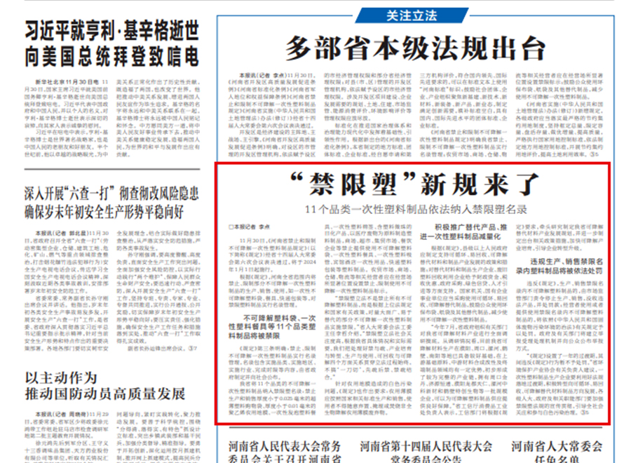 11月30日,《河南省禁止和限制不可降解一次性塑料制品规定》(以下简称“《规定》”)经省十四届人大常委会第六次会议表决通过,将于2024年1月1日起施行。根据《规定》,河南全省范围内将禁止、限制部分不可降解...