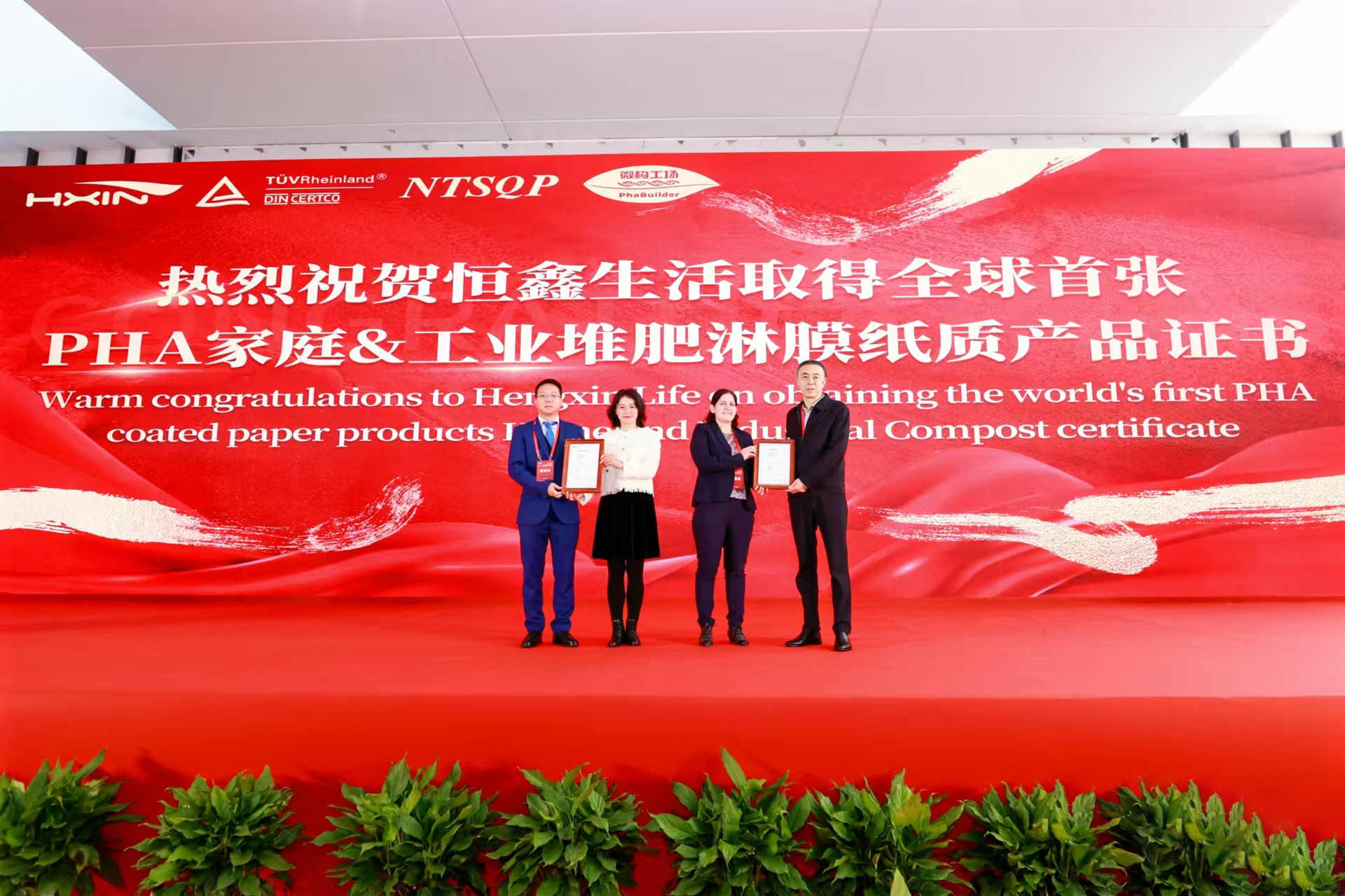 2024年6月17日,在合肥恒鑫生活科技股份有限公司(以下简称“恒鑫生活”)举行了中国首张PHA淋膜纸制产品证书发布会,会议由国家塑料制品检验中心翁云宣主任,DIN德国公司领导(销售总监Lars Kellmer,产...